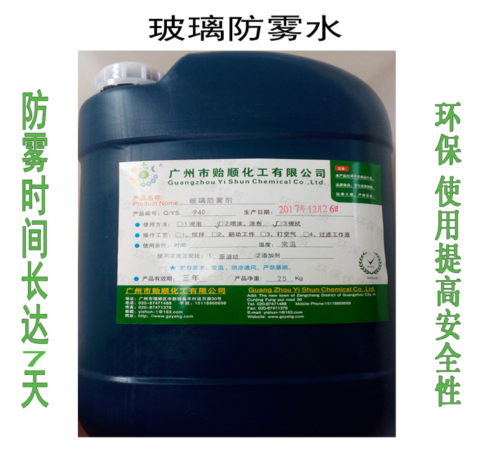 玻璃長效防霧劑(環保天然型) 一、產品編號:Q/YS.940(貽順牌) 環保防霧水 天然型防霧劑 擋風玻璃防霧 眼鏡鏡片噴霧防霧 二、產品適用范圍: 本產品可以防止擋風玻璃,鏡片產生霧,避免視線的影響,提高安全性,本產品環保,對人及環境無霧,防霧時間長達7天。 三、產品指標:1.透明有香味液體。 2.中性,比重>1.0 四、使用方法:對準玻璃進行噴霧,或者用干凈的毛巾粘取本劑在玻璃表面擦拭。自然干燥后,即可達到防霧的效果。